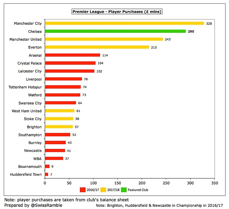 «Челси» не только продавал, но и активно покупал игроков, потратив 290 млн фунтов, что почти столько же, что и за три предыдущих сезона (313 млн). Команду пополнили Мората, Бакайоко, Дринкуотер, Рюдигер, Дзаппакоста, Эмерсон, Жиру и Баркли. Больше за год потратил только «Манчестер Сити».