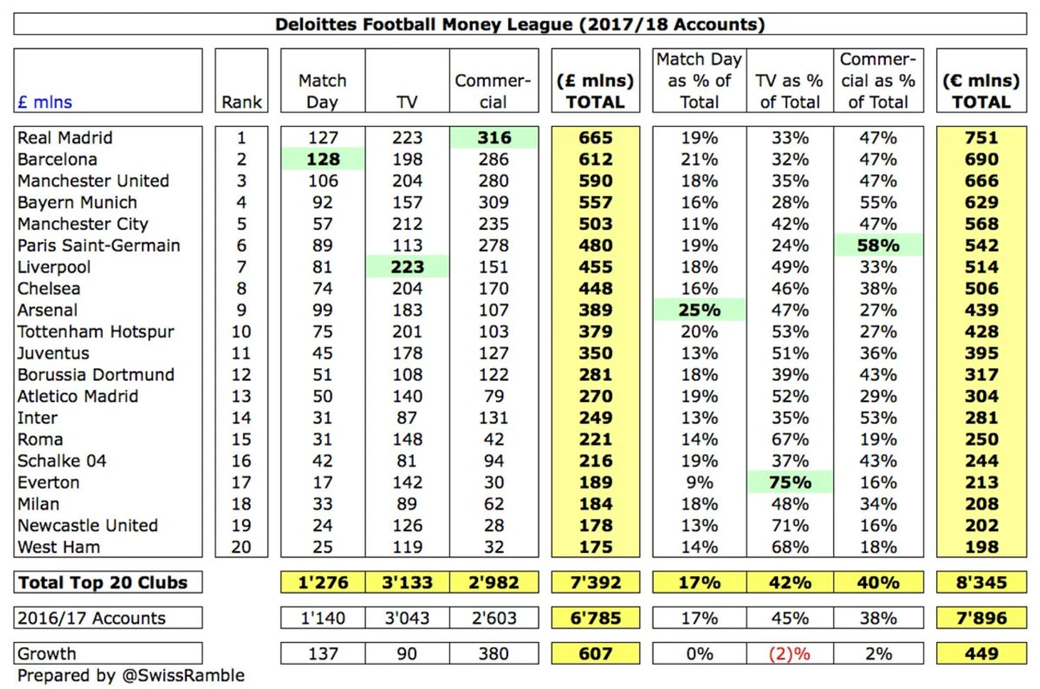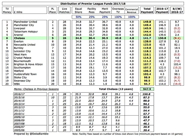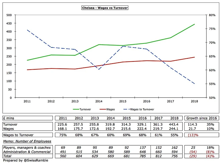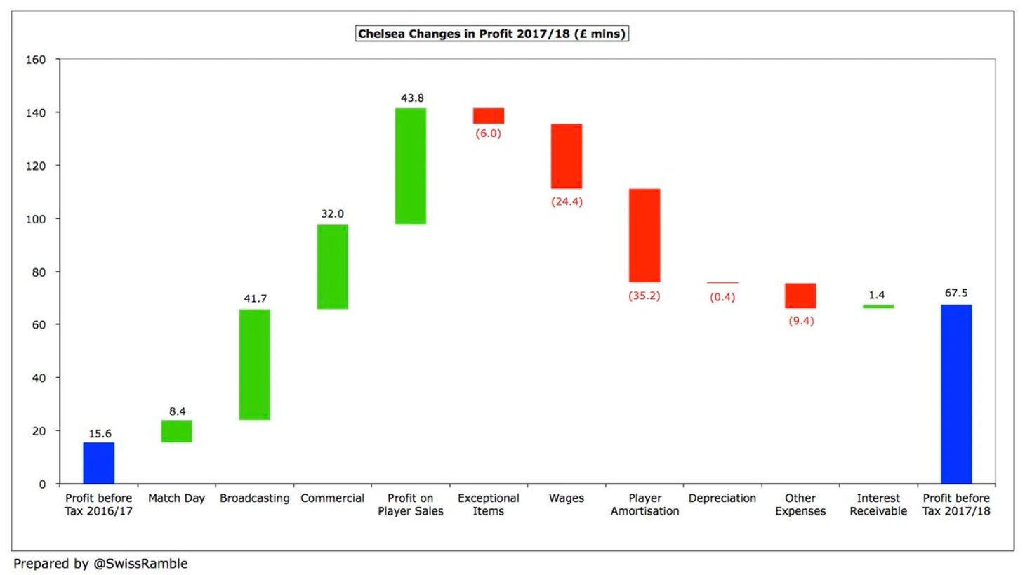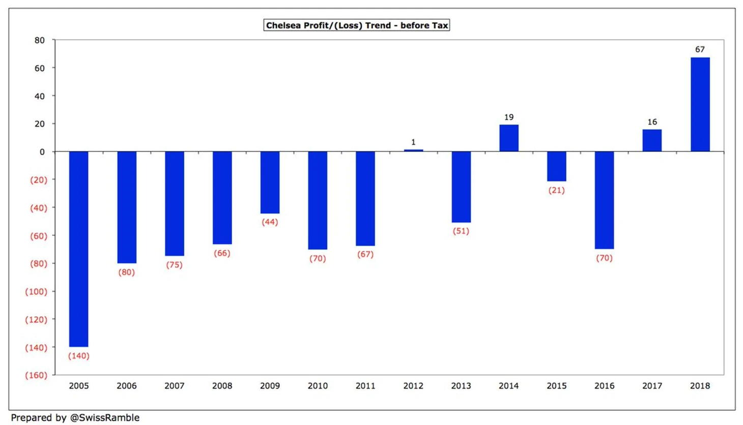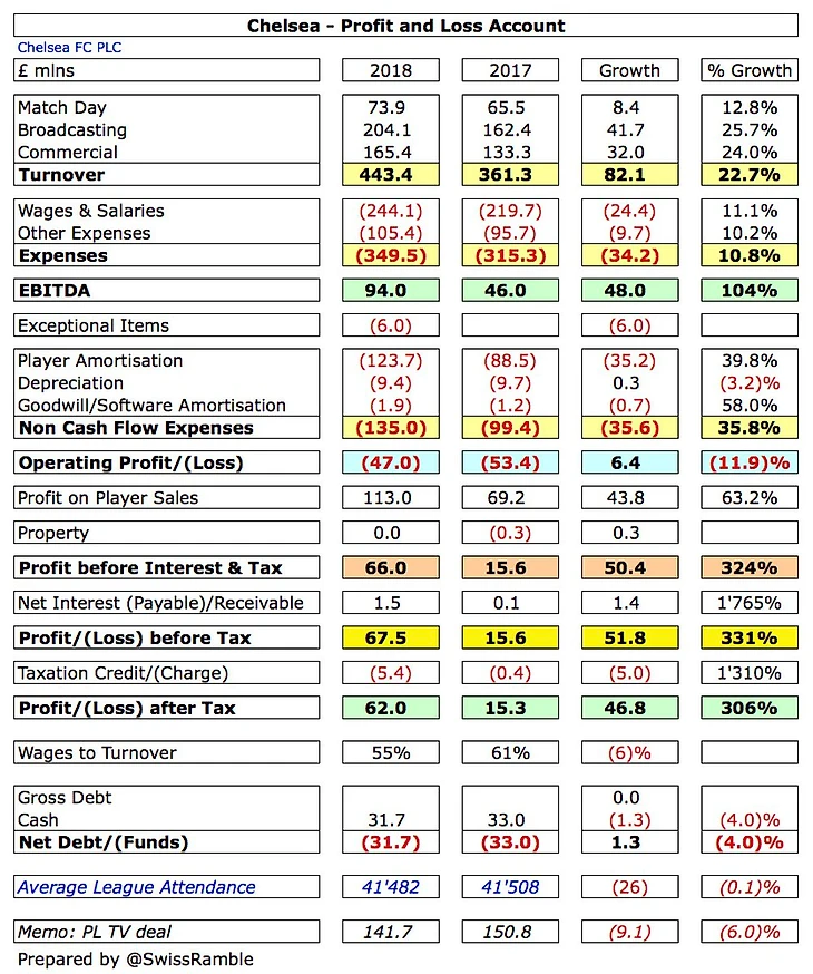 Месяц назад «Челси» представил финансовый отчет за прошлый год (июль 2017– июнь 2018): в нем зафиксирован рекордный для клуба доход в 443 миллиона фунтов. Председатель правления Брюс Бак заявил, что «Челси» удалось создать «надежную коммерческую структуру, которая становится фундаментом для достижения успехов на футбольном поле», и что начиная с 2012-го клуб исправно следует правилам ФФП. Сам финансовый отчет здесь, а с основными цифрами давайте разбираться с помощью Swiss Ramble (твиттер о футбольном бизнесе, 91,7 тысяч подписчиков).