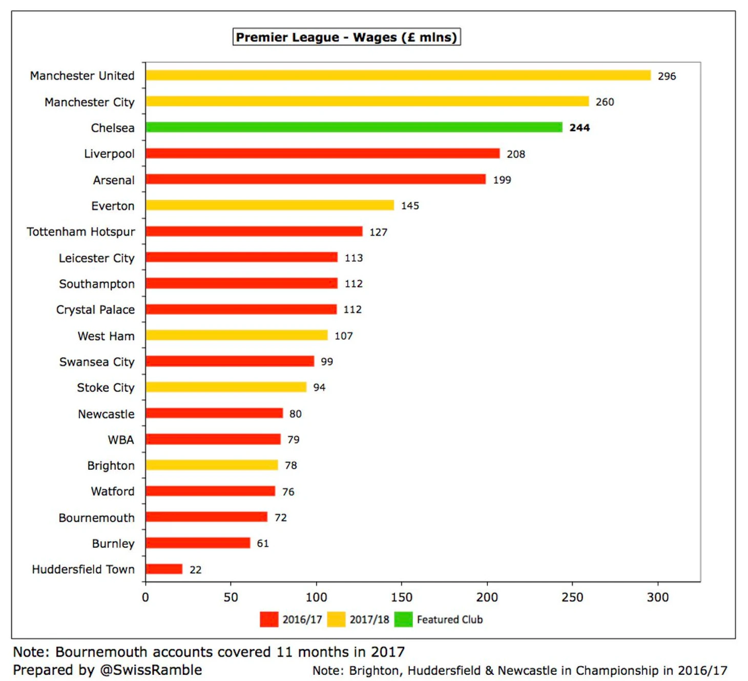 После небольшого снижения в сезоне-2016/17 зарплатная ведомость «Челси» вновь выросла – на этот раз на 11% (с 220 до 244 млн фунтов), приблизившись к «Манчестер Сити» (260 млн) и «Манчестер Юнайтед» (296 млн).