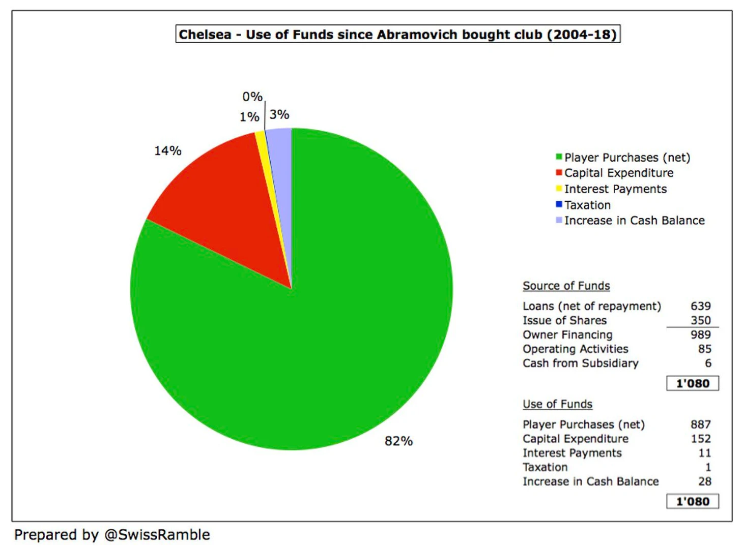 В 2017/18 Fordstam Limited инвестировал в «Челси» 69 млн фунтов; общая сумма, которую российский олигарх вложил в клуб, составляет около 1 млрд фунтов. Большая часть этих средств была потрачена на покупку футболистов (887 млн или 82%). 69 млн в прошлом году (в два раза больше, чем в 2017-м) можно считать свидетельством того, что Абрамович по-прежнему готов вкладываться в «Челси» и не намерен продавать клуб. Или же наоборот, готовится к продаже и создает инвестиционно привлекательный объект.