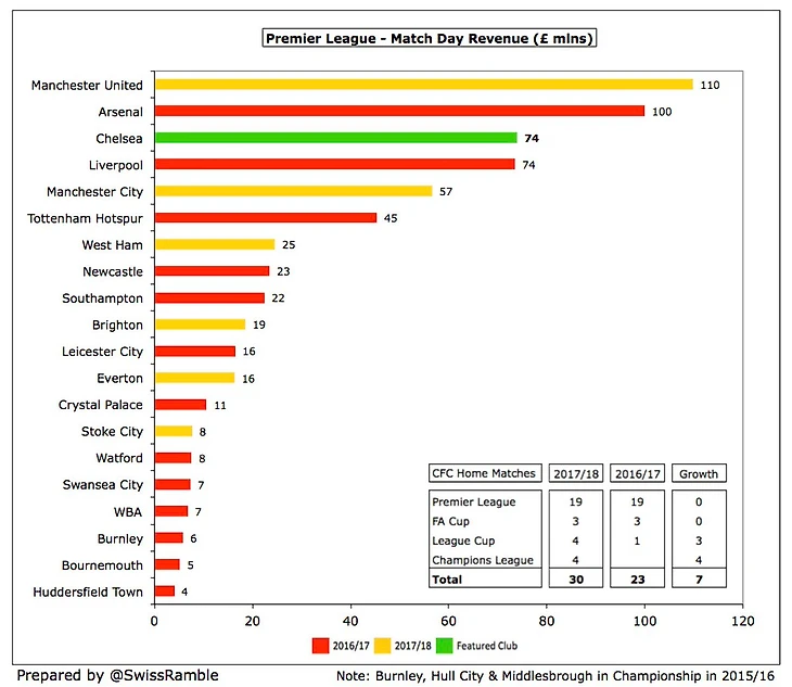 Рост прибыли в день матча (на 13% – с 66 млн до 74 млн) связан с тем, что «Стэмфорд Бридж» принял на 7 матчей больше (+4 в ЛЧ и 3 в кубках). По этому источнику лондонцы на третьем месте (временно, так как не опубликовавший отчет «Ливерпуль» сдвинет их ниже).