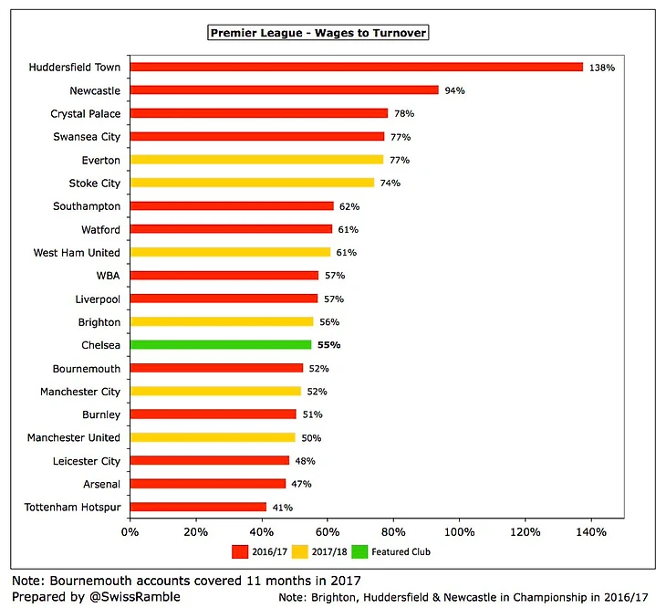 Однако важнее рассматривать не просто сумму зарплатного фонда, а ее отношение к общему обороту. Этот показатель у «Челси» улучшился с 61% до 55% благодаря увеличению оборота, но по-прежнему хуже, чем у обоих клубов из Манчестера (50% – у «Юнайтед» и 52% – у «Сити»).