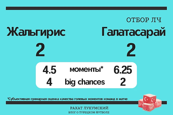 «Галатасарай» по делу потерял очки в Литве. Забегая вперед, именно «Жальгирис» мне показался самым достойным конкурентом турецких команд на этом этапе отбора. Конечно, я бы не стал ставить на итоговый проход «Жальгириса», но шансы у литовцев определенно имеются. Я бы дал 80 на 20 на итоговый проход «Галатасарая».