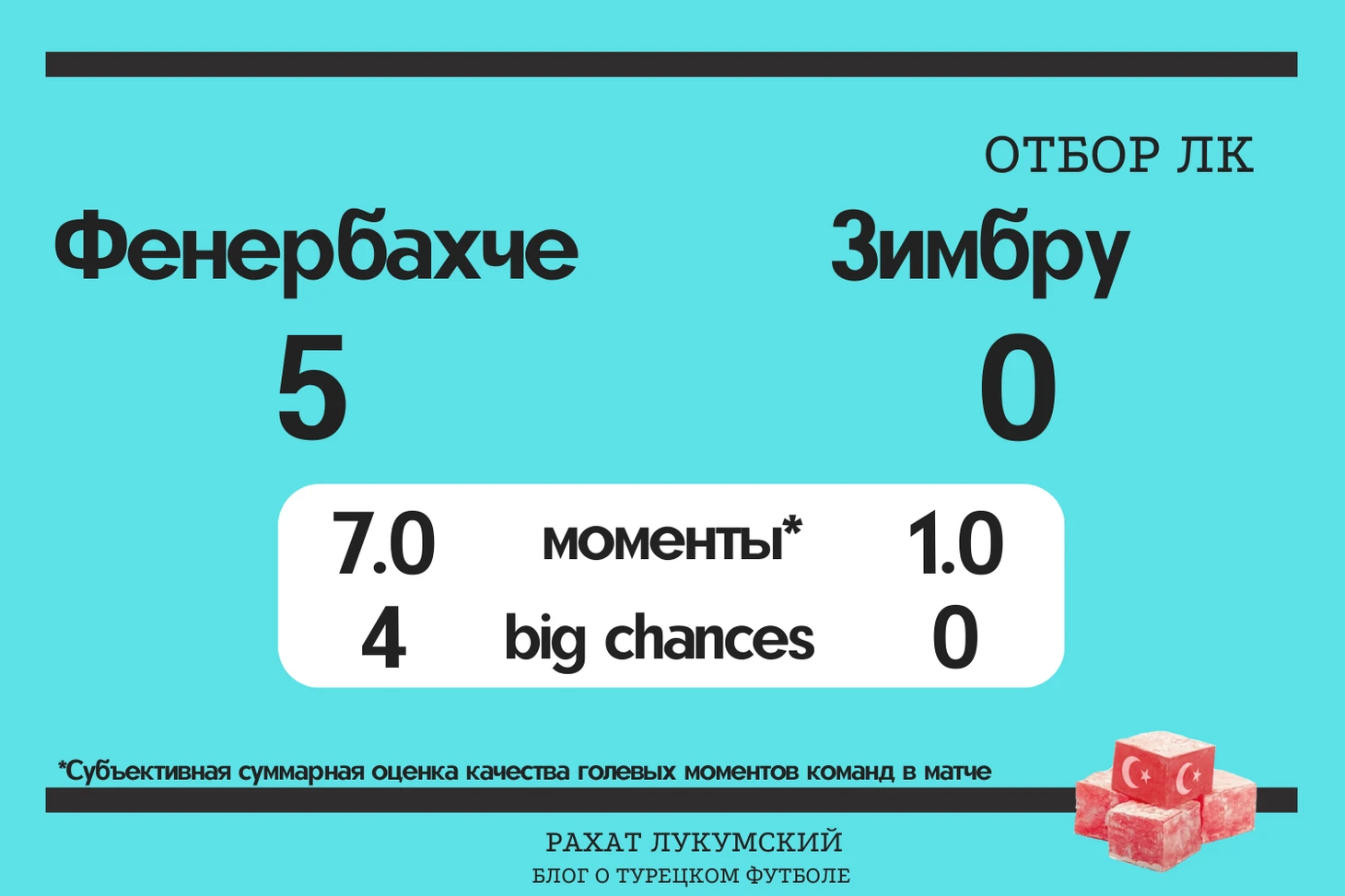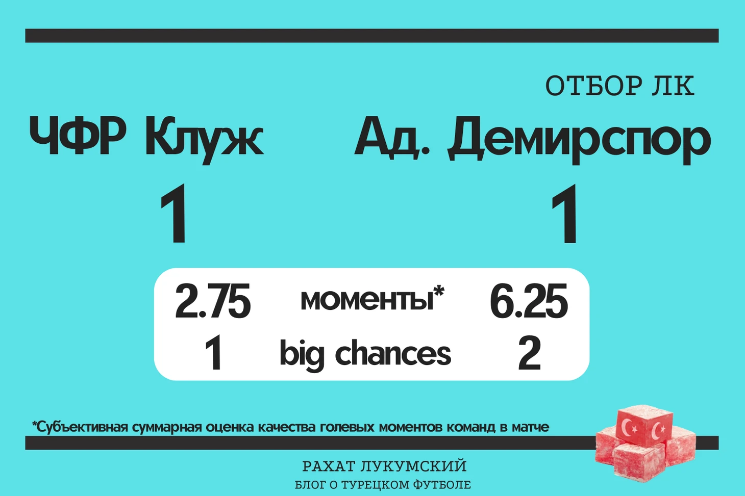 В отборочных раундах еврокубков поставщики данных не особо балуют сколько-нибудь глубокой статистикой, поэтому в качестве эксперимента в графике вместо xG я использовал свою систему градации опасных моментов. Оценка сугубо субъективная, но, думаю, что если вы не смотрели матч целиком, она добавит вам информации о перформансе команд. Сжатая информация отображена на голубых плашках, с более подробной можно ознакомится в гугл-таблице.