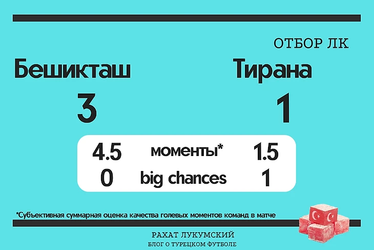 Что касается самой игры, «Бешикташ» ожидаемо владел преимуществом, но речи о тотальной доминации не шло. За весь матч я не насчитал у “орлов” ни одного момента, который можно было охарактеризовать как big chance. Голы «Бешикташа» — результат отличной реализации. Турецкая команда в первом тайме создала четыре средних (далеко не “стопроцентных”) момента и реализовала два из них. Первый гол после навеса с фланга забил Онур Булут, а затем с паса Абубакара отличился Мулека.
