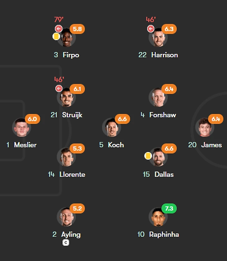В последних 5 матчах вы можете увидеть, в какой яме оказался Марсело Бьелса. Но здесь важно отметить, что часть ключевых игроков надолго выбыла из-за травм. Среди них Келвин Филлипс, Патрик Бэмфорд и Лиам Купер. Джесси Марш большую часть сезона 2022/23 может расчитывать на полноценный стартовый состав команды.