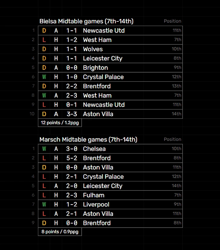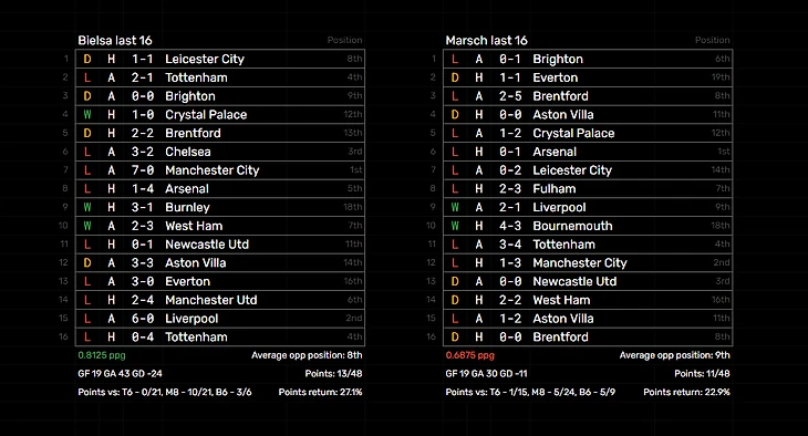 Марсело Бьелса был уволен после того, как сумел одержать всего 2 победы в 12 матчах лиги. У Джесси Марша сейчас 2 победы в 16 матчах. Вот сравнение их формы в последних 16 матчах. Я нахожу раздражающим тот факт, что игра Джесси Марша приносит меньший выхлоп, но к нему применяются менее высокие требования.