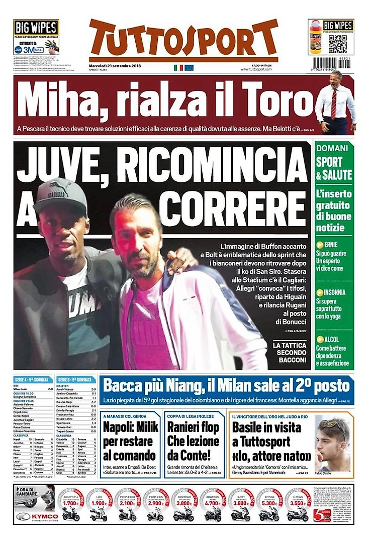 Фото Буффона рядом с Болтом символизирует спринт, который Бьянконери должны обнаружить после поражения на «Сан Сиро». Этим вечером на «Стэдиуме» будет «Кальяри»: Аллегри «призывает» болельщиков и выпускает Ругани на место Бонуччи.
