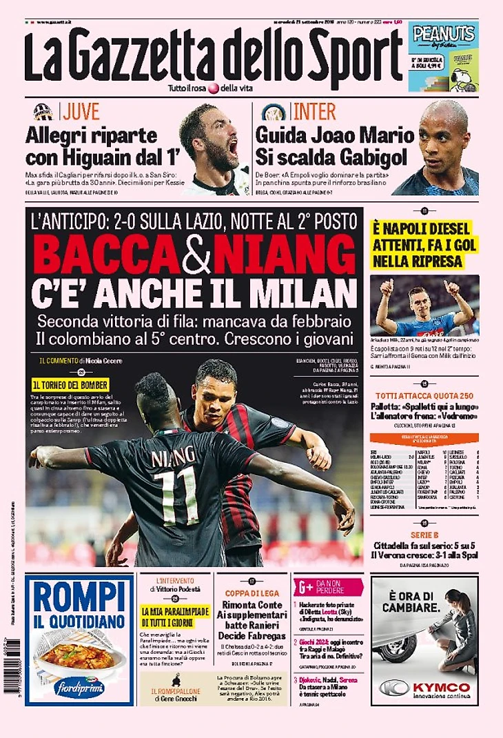 «Бакка&Ньянг, есть также «Милан». Заголовки Gazzetta, TuttoSport и Corriere за 21 сентября