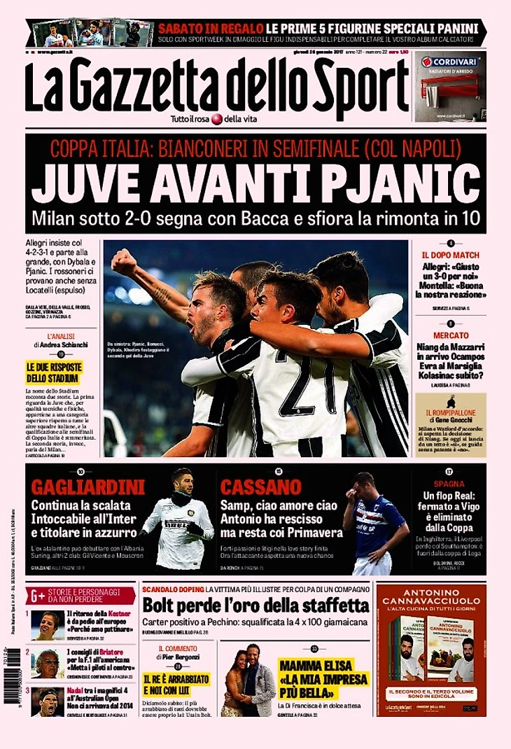 Кубок Италии: Бьянконери в полуфинале (с «Наполи»). У «Милана» при 2:0 забил Бакка и был упущен камбэк вдесятером. Аллегри настаивает на 4-2-3-1 и начинает отлично благодаря Дибале и Пьяничу. Россонери попробовали отыграться даже без Локателли (удалён).