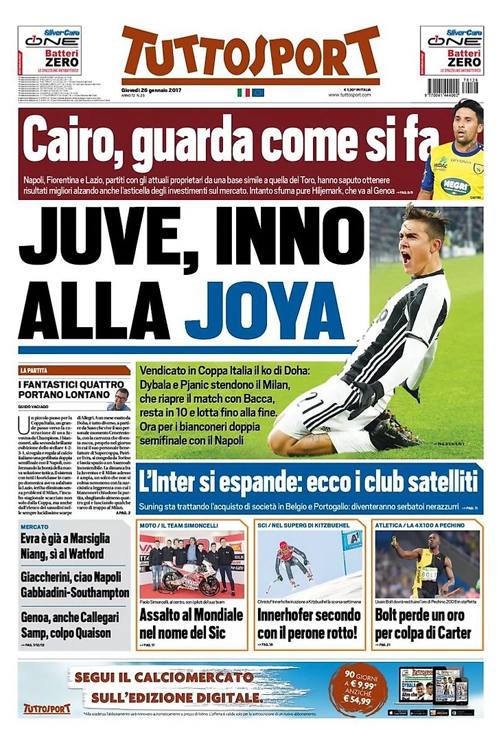 Месть в Кубке Италии за поражение в Дохе: Дибала и Пьянич остановили «Милан», который вновь открыл матч благодаря Бакке, остался в 10-ом и боролся вплоть до самого конца. Теперь для Бьянконери предстоит двойной полуфинал с «Наполи».