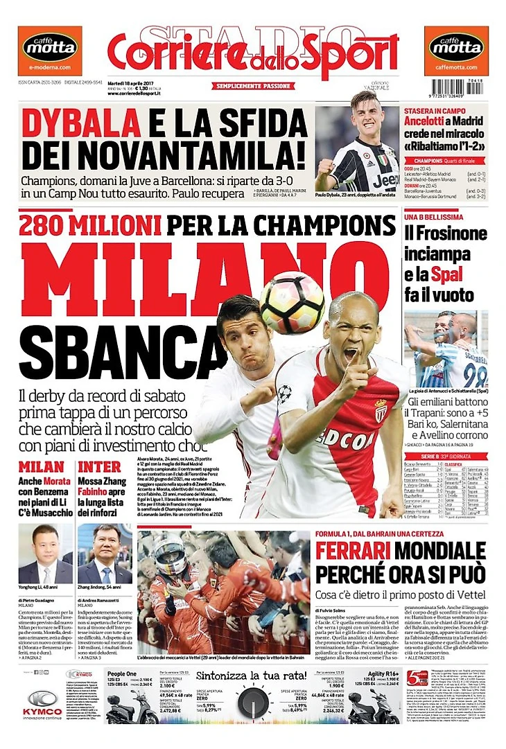 «Милан тратится». Заголовки Gazzetta, TuttoSport и Corriere за 18 апреля