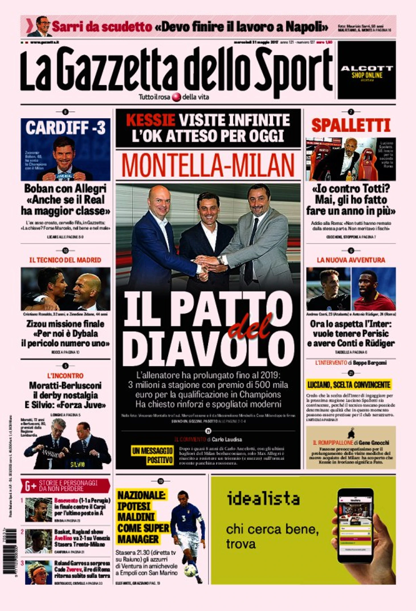 Монтелла-«Милан», тренер продлил контракт до 2019: 3 миллиона за сезон с бонусом в 500 тысяч евро за квалификацию в Лигу Чемпионов. Он просит усиления и современную раздевалку.