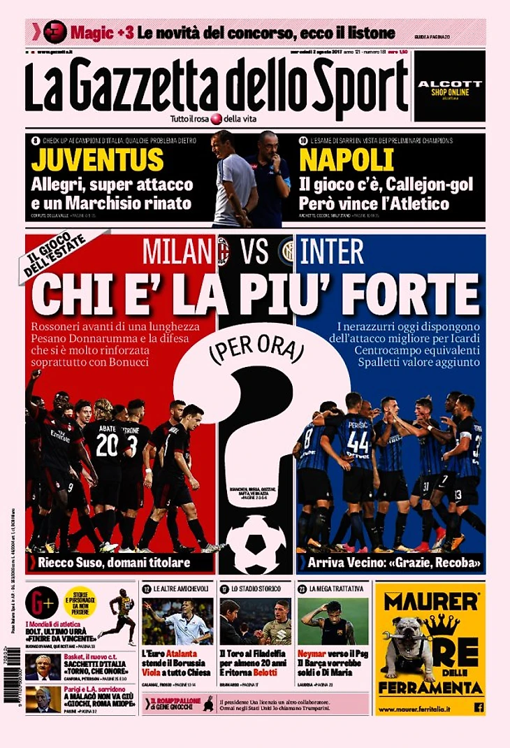 «Милан» Vs «Интер», кто сильнее (на данный момент)?. Заголовки Gazzetta, TuttoSport и Corriere за 2 августа