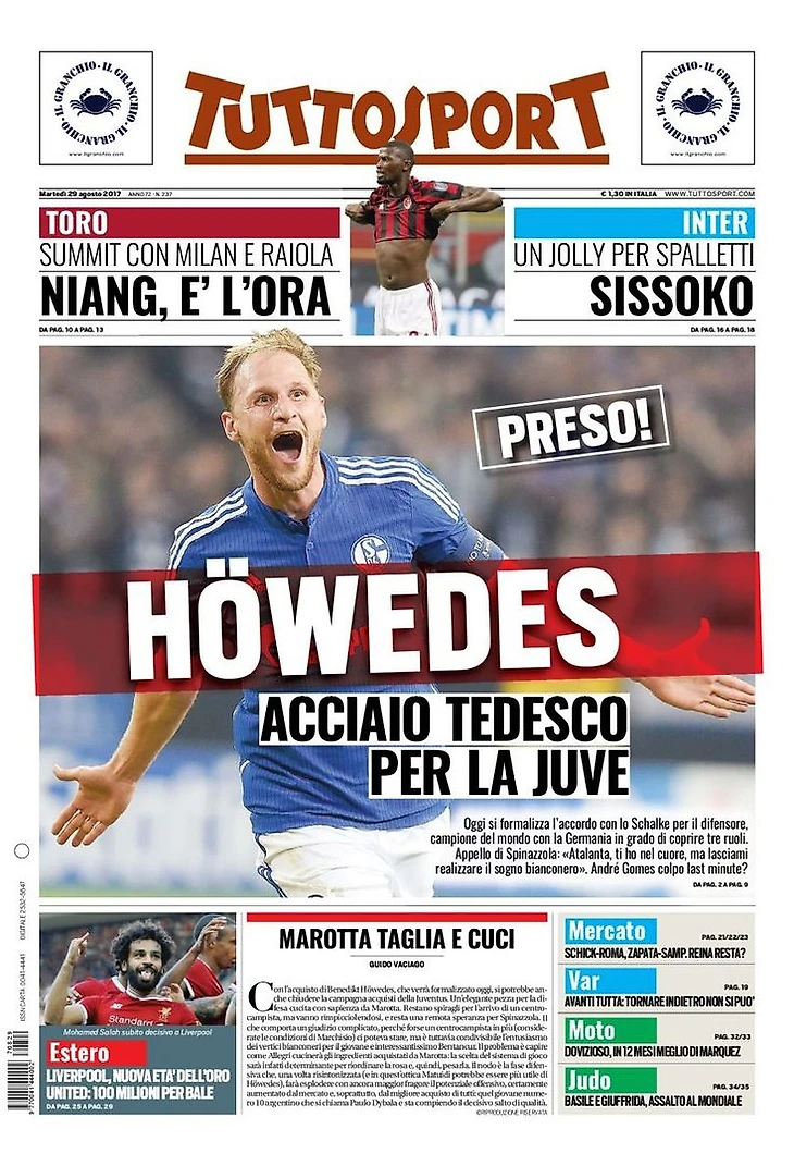 Подписан Хёведес, штурм Кейта, давление на Гомеша, и Спинаццола… «Шальке» сдаётся: немецкий защитник будет в распоряжении Аллегри. Готов перезапуск переговоров, чтобы убедить «Лацио», который рискует потерять сенегальца бесплатно. «Барсе» предложены 35 миллионов за португальца. Крайний защитник «Аталанты»: «Хочу к Бьянконери».