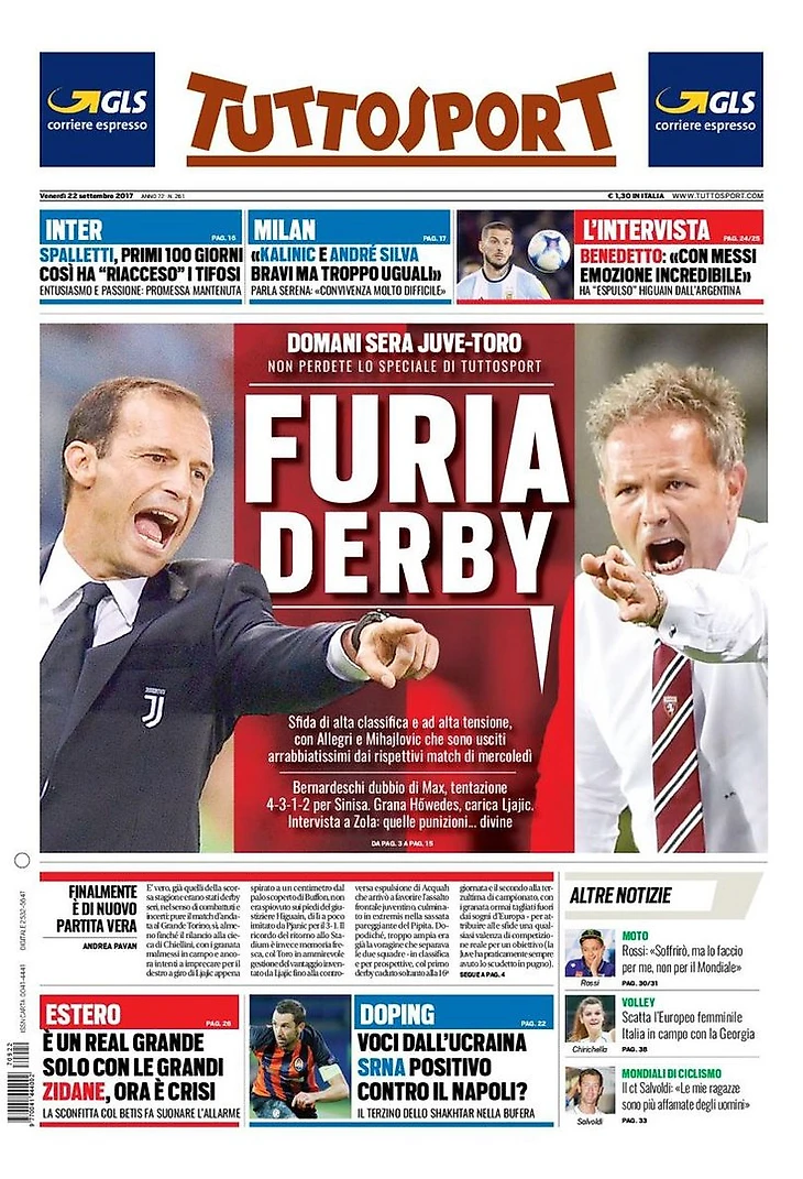 Завтра вечером «Юве»-«Торино». Схватка высоко в таблице и с высоким напряжением, с Аллегри и Михайловичем, которые ушли очень рассерженными после прошедших в среду матчей. Бернардески под сомнением у Макса, искушение в виде 4-3-1-2 для Синиши. Травма Хёведеса, заряженность Льяйича. Интервью у Дзолы: «Эти штрафные… божественны».