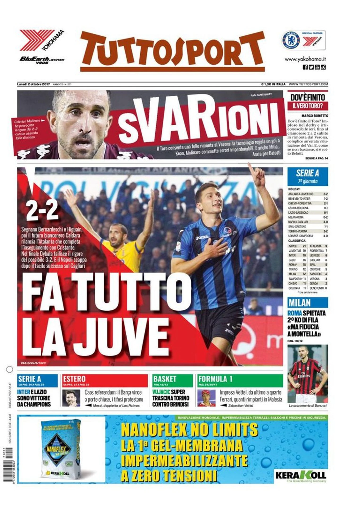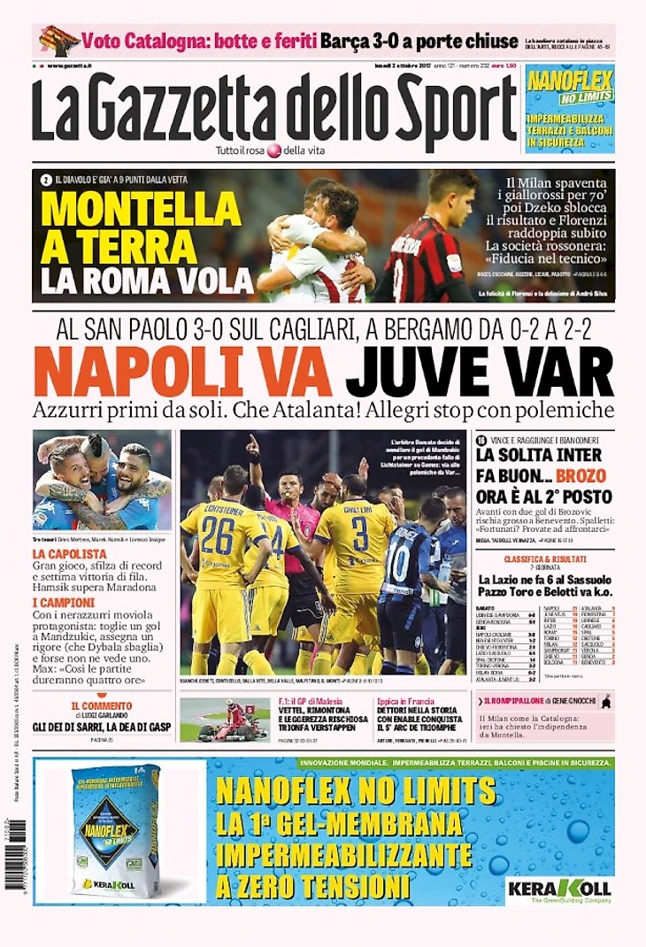 На «Сан Паоло» 3:0 против «Кальяри», в Бергамо от 0:2 к 2:2. Адзурри первые в одиночестве. Какова «Аталанта»! Аллегри остановлен со спорами. Лидер провёл отличную игру, улучшив рекорд и одержав седьмую победу подряд. Гамшик превзошёл Марадону. У чемпиона против Нерадзурри главным героем стали видеоповторы: отменён гол Манджукича, назначен пенальти (который не реализовал Дибала) и возможно не замечен один. Макс: «Так матчи будут продолжаться по четыре часа».
