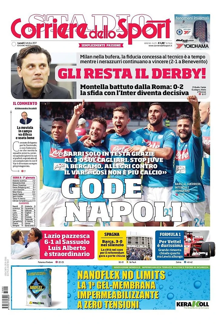 Удовольствие «Наполи». Заголовки Gazzetta, TuttoSport и Corriere за 2 октября