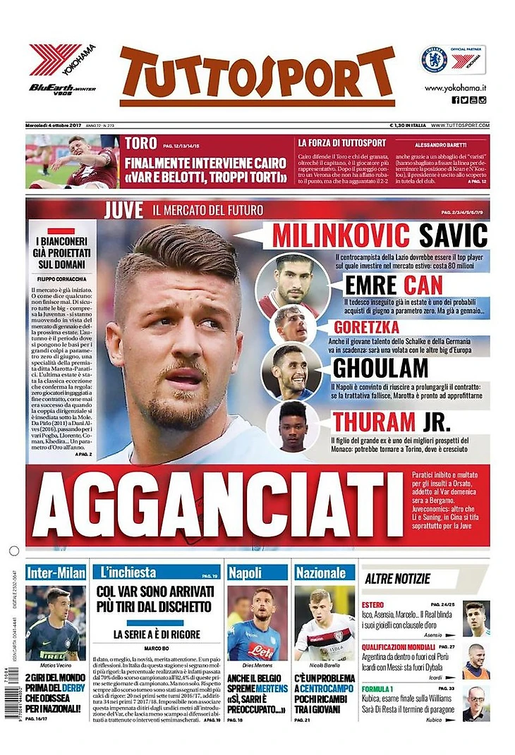 «Юве», рынок будущего. Милинкович-Савич: полузащитник «Лацио» должен стать топ-игроком, в которого будут инвестировать в летнее трансферное окно: он стоит 80 миллионов. Эмре Джан: за немцем следят уже с лета и это один из возможных новичков летом, который придёт свободным агентом. Но уже в январе… Горетцка: также у молодого таланта «Шальке» и Германии истекает контракт – будет гонка других европейских топ-клубов. Гулям: «Наполи» убеждён в успехе продления контракта – если переговоры усложнятся, Маротта готов воспользоваться этим. Тюрам-младший: сын бывшего игрока и один из самых перспективных в «Монако»: он может вернуться в Турин, где вырос. Паратичи дисквалифицирован и наказан за оскорбления Орсато, отвечавшего за видеоповторы в воскресенье вечером в Бергамо. Ювекономика: нечто другое, чем Ли и Suning, в Китае болеют по большей части за «Юве».
