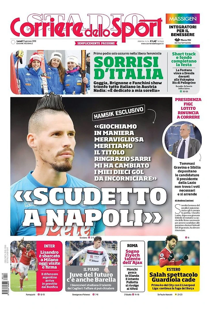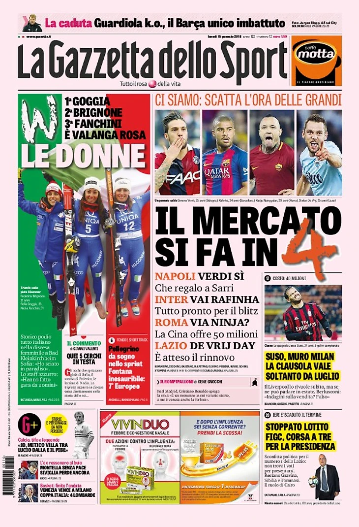 «Наполи», Верди согласен, каков подарок для Сарри. «Интер», давай Рафинья, всё готово для встречи. «Рома», уйдёт Ниндзя? Китай предлагает 50 миллионов. «Лацио», день Де Врея, ожидается продление.