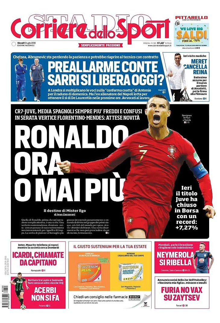 Обложки итальянских спортивных газет сегодня. На всех – Роналду