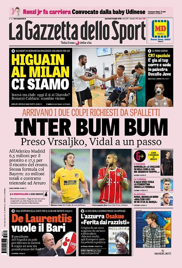 Приходят два новичка, которых просил Спаллетти. Подписан Врсалько, Видаль в шаге от перехода. В «Атлетико Мадрид» 6,5 миллионов за аренду и 17,5 за выкуп хорвата. Та же формула с «Баварией»: 20 миллионов в общем и трёхлетний контракт для Артуро.