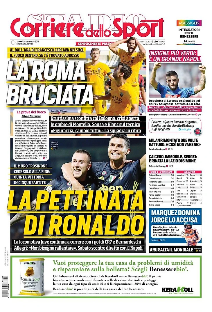 CR7 раскупорил «Юве». Заголовки Gazzetta, TuttoSport и Corriere за 24 сентября