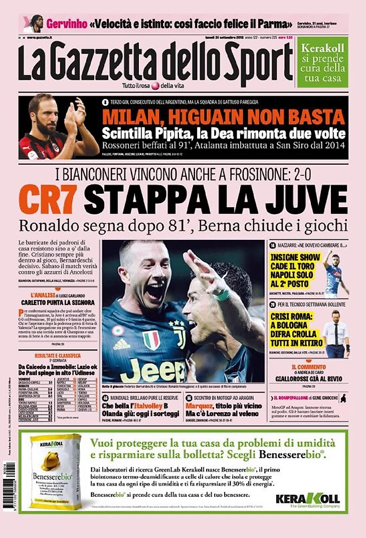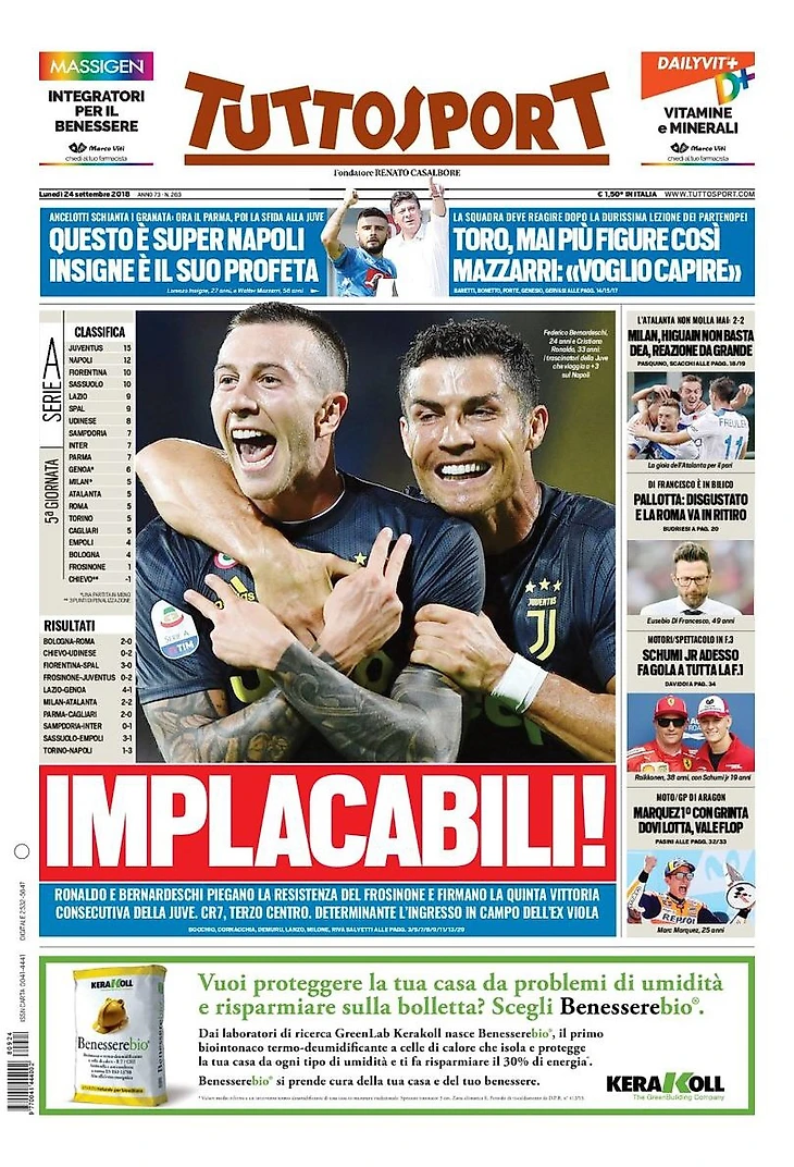Бьянконери победили также «Фрозиноне»: 2:0. Роналду забил спустя 81 минуту, Берна завершил матч. Баррикады хозяев поля сопротивлялись до 9 минут до конца матча. Криштиану всегда был наиболее вовлечённым в игру, Бернардески стал решающим. В субботу матч истины против Адзурри Анчелотти.