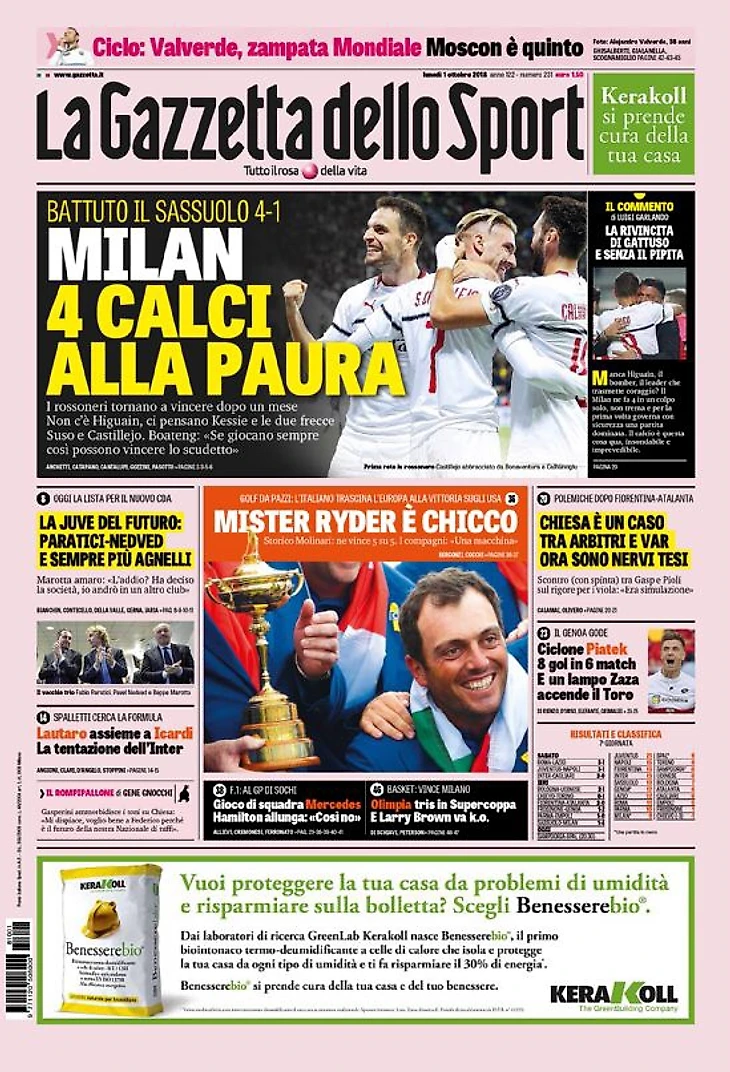 «Милан», 4 удара по страху. Заголовки Gazzetta, TuttoSport и Corriere за 1 октября