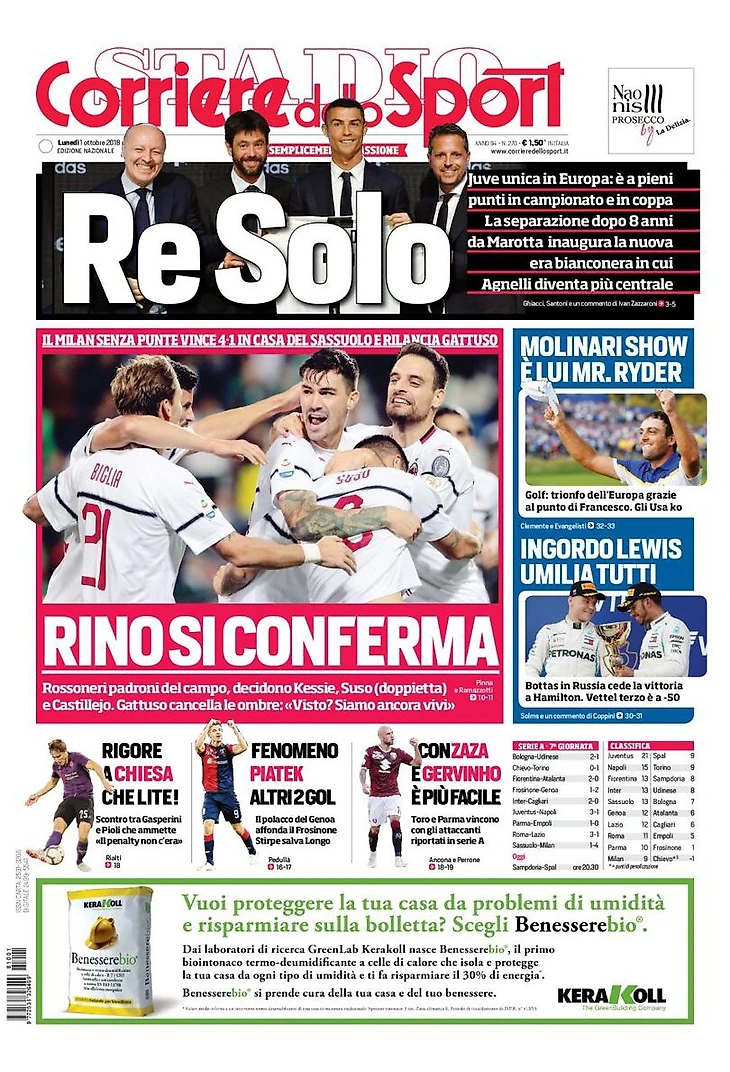 «Милан» без нападающих выиграл 4:1 дома у «Сассуоло» и оживил Гаттузо. Россонери выглядели хозяевами на поле, всё решили Кесси, Сусо (дубль) и Кастильехо. Гаттузо отметает тени: «Видели? Мы ещё живы».