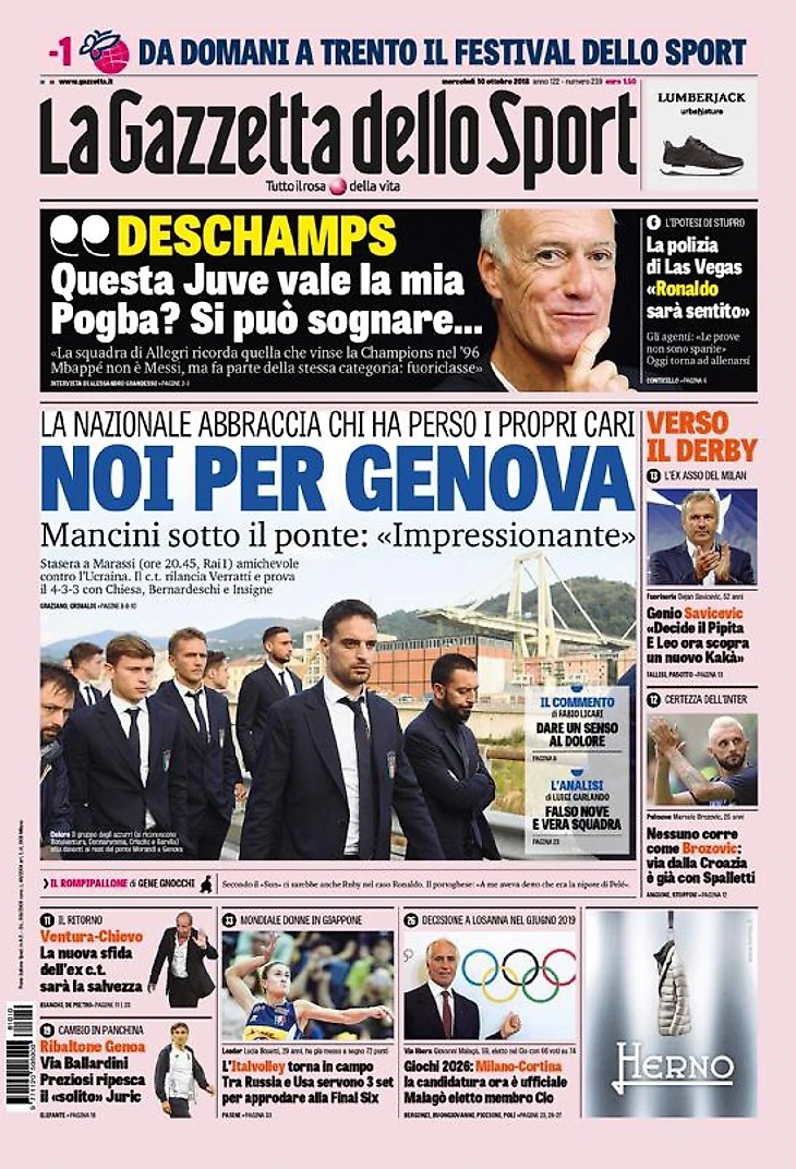 На мосту Моранди трогательное возложение дани погибшим от Адзурри: волнение и слёзы. Этим вечером (20:45 CET) товарищеский матч с Украиной.