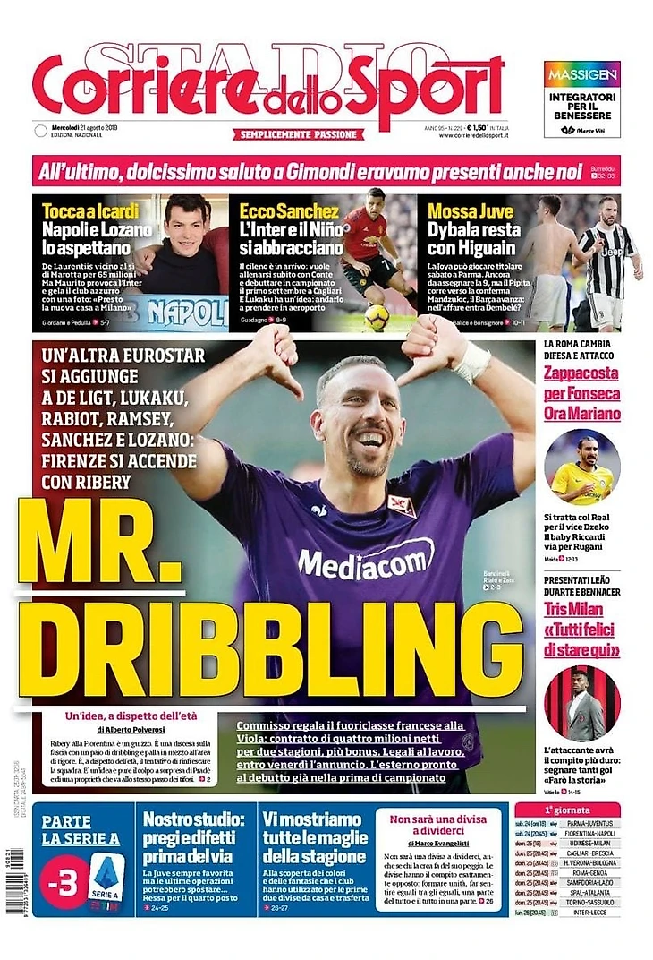 Ещё одна европейская звезда присоединится к Де Лигту, Лукаку, Рабьо, Рэмси, Санчесу и Лосано: Флоренция зажигает с Рибери. Коммиссо дарит французскую суперзвезду «фиалкам»: контракт на четыре миллиона чистыми на два сезона, плюс бонусы. Адвокаты за работой, к пятнице будет объявление. Полузащитник готов дебютировать уже в первом туре чемпионата.