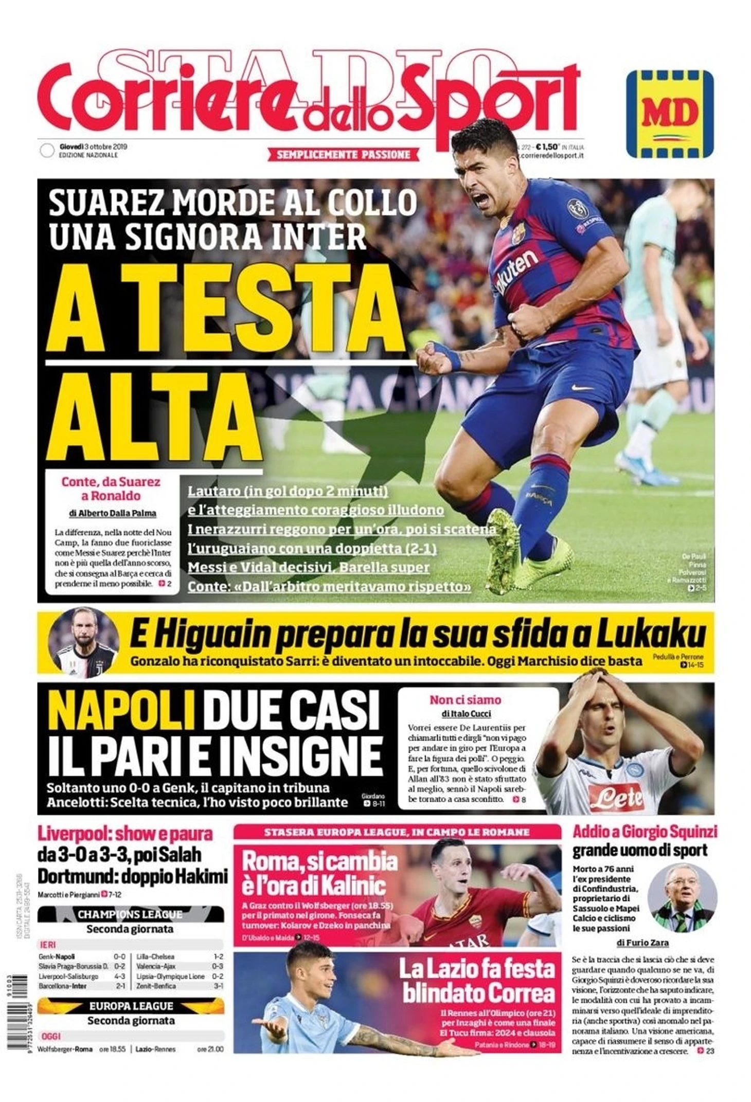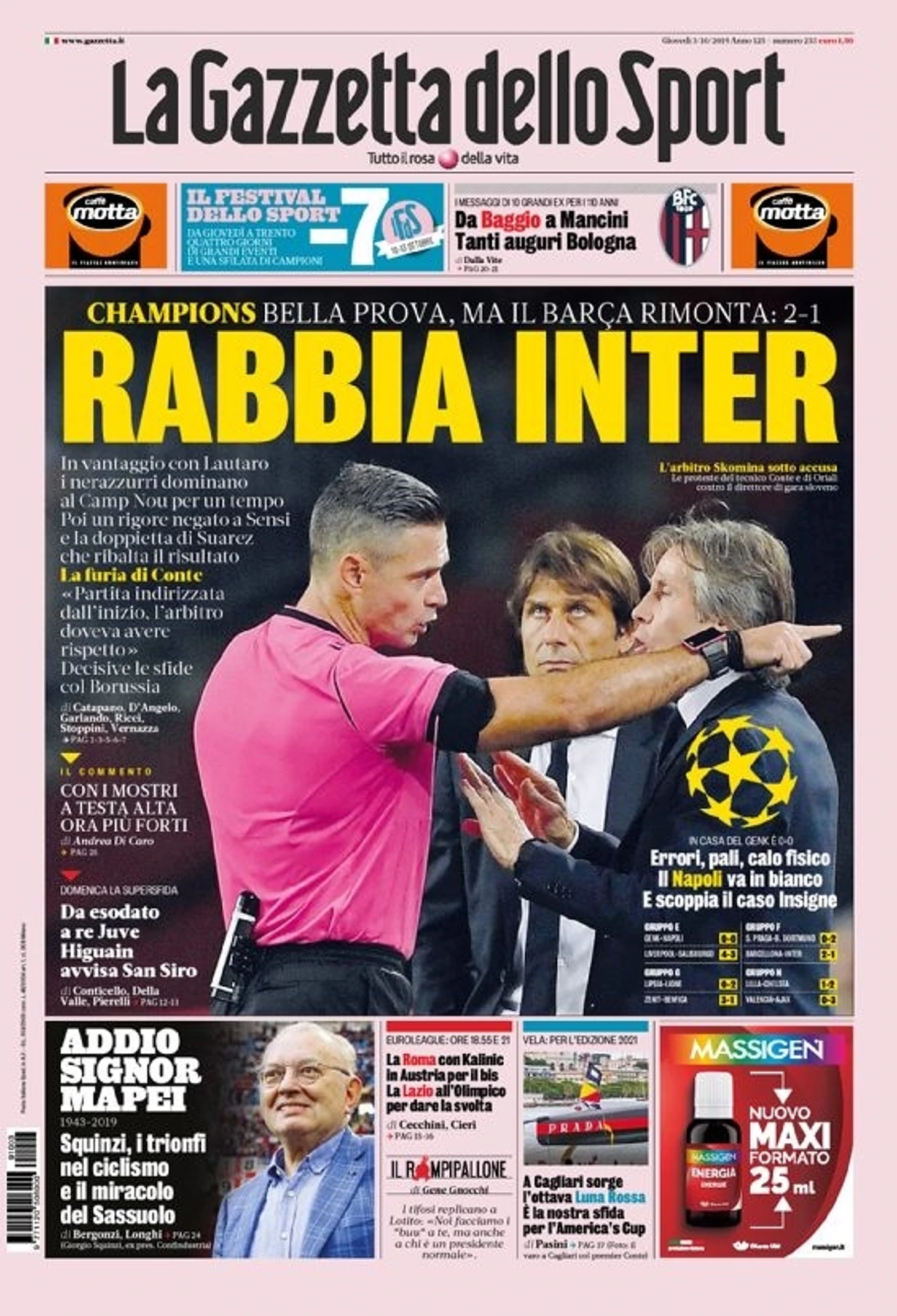 Лига Чемпионов: хорошая попытка, но «Барса» отыгралась 2:1. Выйдя вперёд благодаря Лаутаро, Нерадзурри доминировали на «Камп Ноу» в течение тайма. Затем не дали пенальти на Сенси и Суарес сделал дубль, который перевернул результат. Ярость Конте: «Матч был адресован с самого начала, арбитр должен иметь уважение». Решающими будут схватки с «Боруссией».