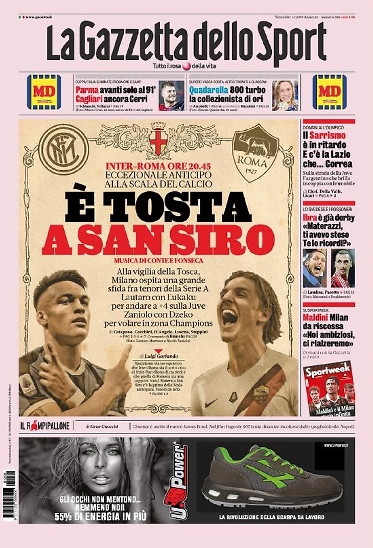 «Интер»-«Рома», 20:45 CET. Исключительный вынесенный матч в «Ла Скала» футбола. В преддверии «Тоска», Милан принимает большую схватку между тенорами Серии А. Лаутаро с Лукаку, чтобы отдалить на 4 очка от «Юве». Дзаньоло с Джеко, чтобы взлететь в зону Лиги Чемпионов.