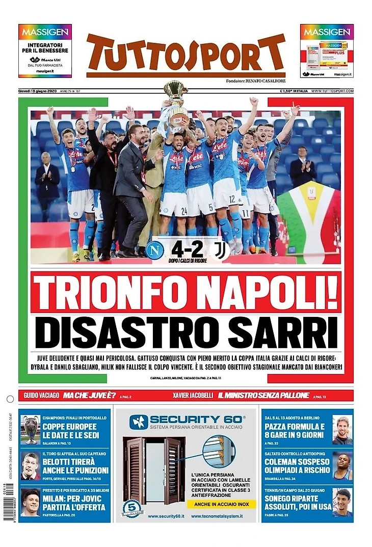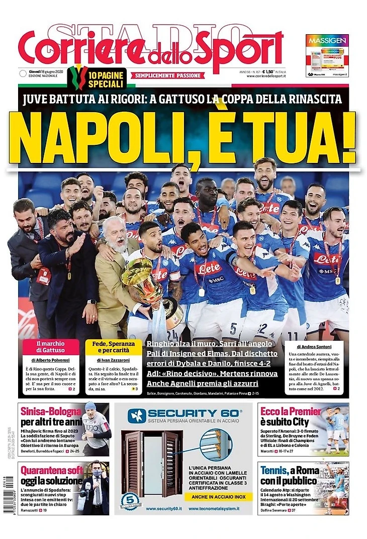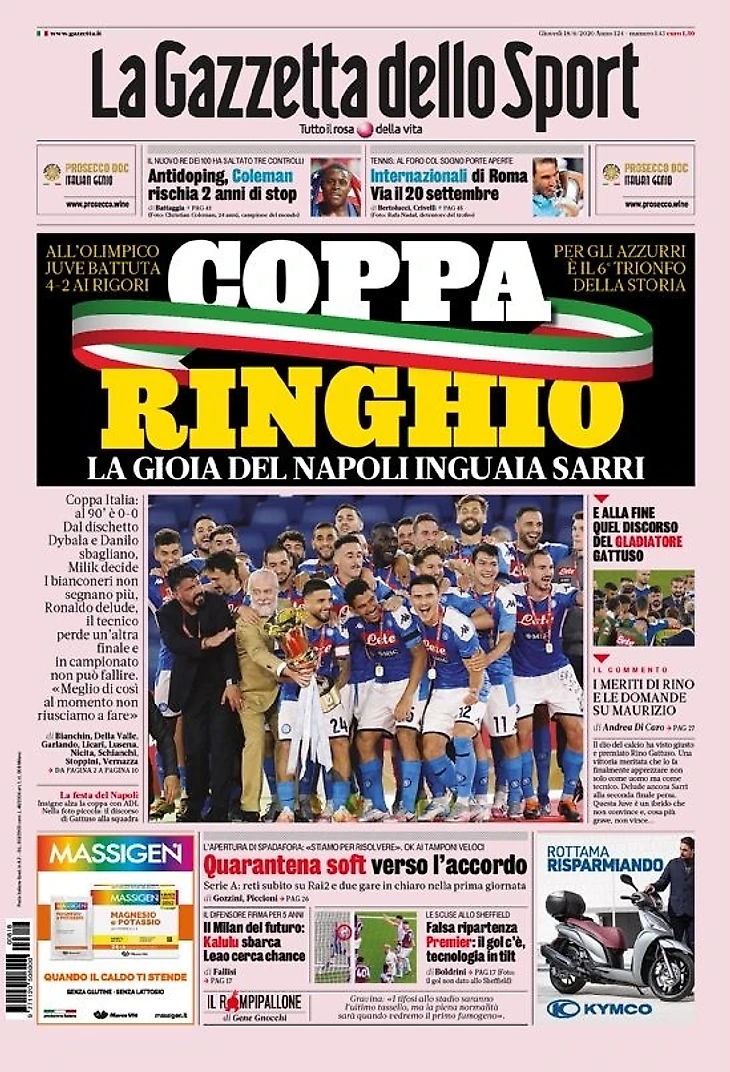 «Юве» побеждён по пенальти: у Гаттузо Кубок Возрождения. Рино возвёл стену, Сарри в углу. Штанги Инсинье и Эльмаса. С точки ошиблись Дибала и Данило, закончив 4:2. АДЛ: «Рино – решающий». Мертенс продлит контракт. Даже Аньелли наградил Адзурри.