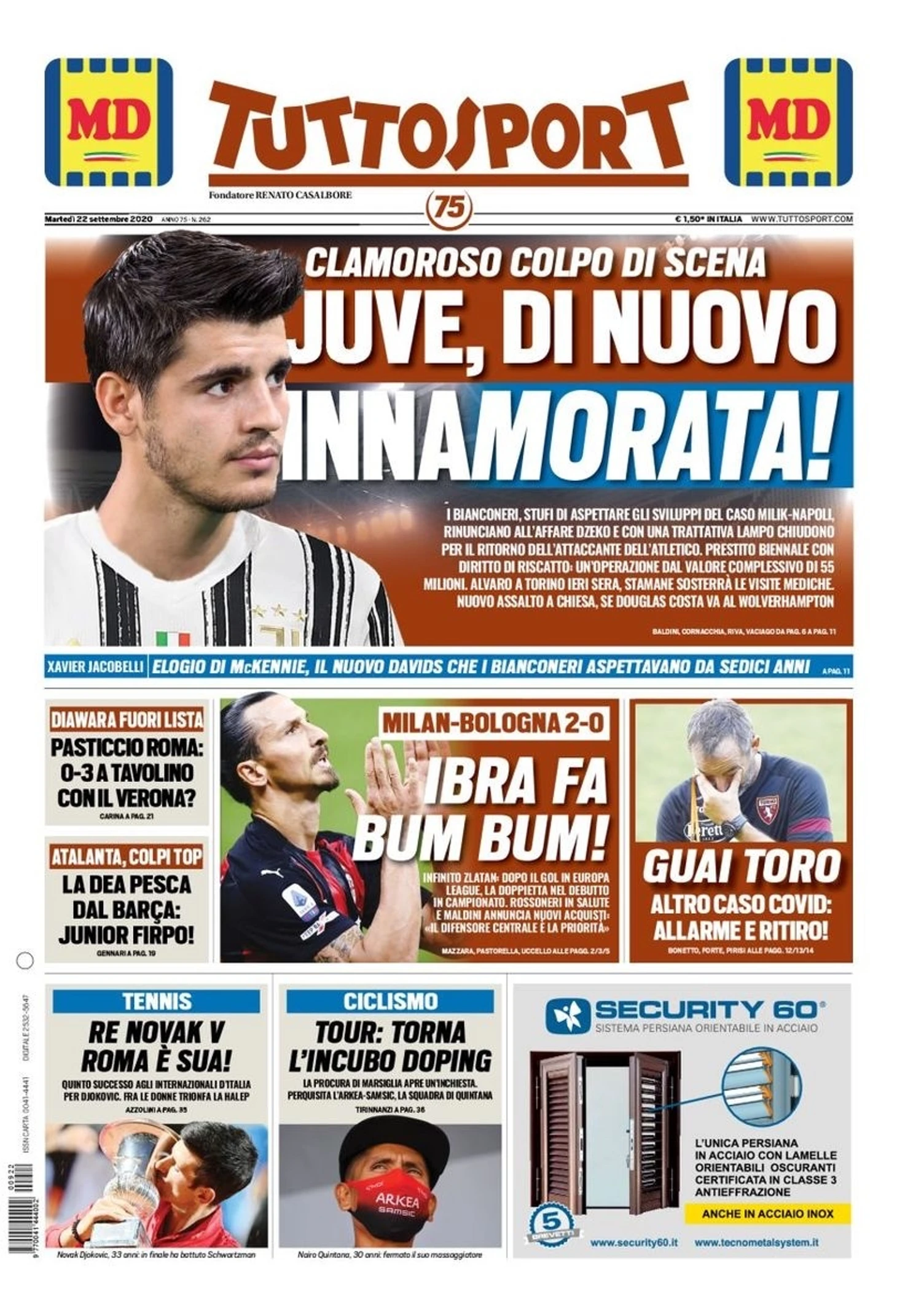 Невероятная неожиданная сделка. Бьянконери, уставшие ждать разрешения ситуации Милик-«Наполи», отказались от сделки по Джеко и в молниеносных переговорах завершили возвращение нападающего из «Атлетико». Двухгодичная аренда с правом выкупа: полная стоимость операции составит 55 миллионов. Альваро в Турине со вчерашнего вечера, сегодня днём он пройдёт медицинский осмотр. Новый штурм Кьезы, если Дуглас Коста уйдёт в «Вулверхэмптон».