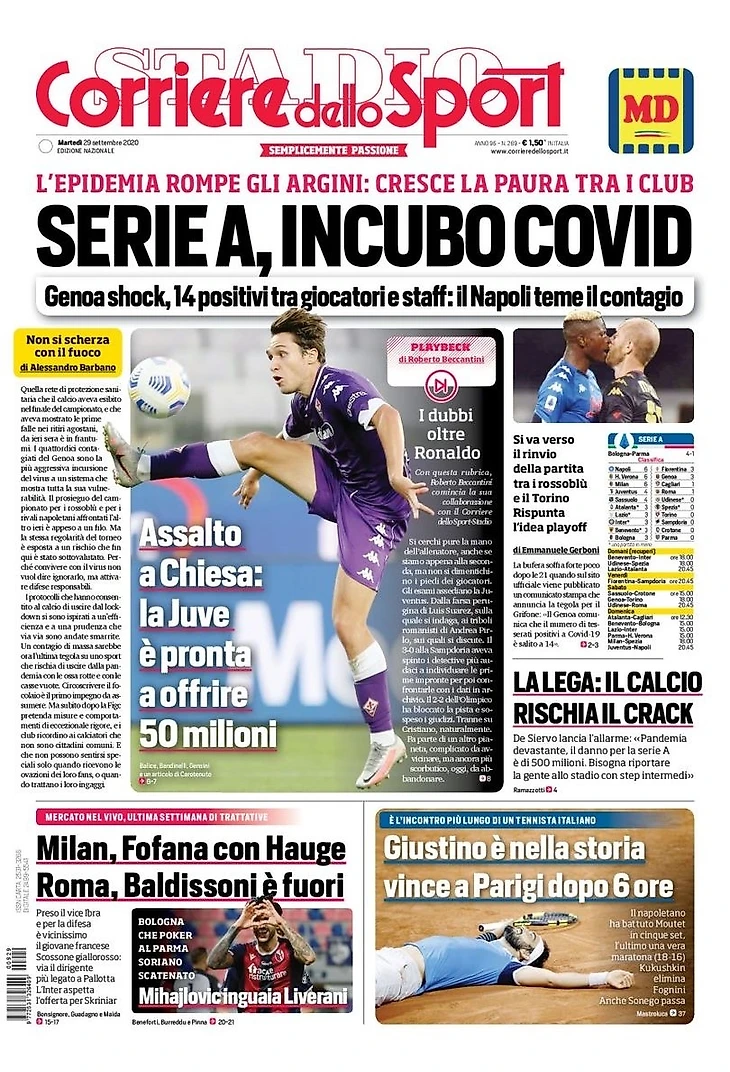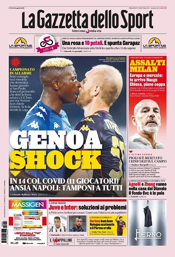 Эпидемия врывается на побережье: растёт страх среди клубов. «Дженоа» шокирует, 14 позитивных тестов у игроков и штаба: «Наполи» опасается болезни. Всё идёт к переносу матча между Россоблу и «Торино». Проверка идеи плей-офф.