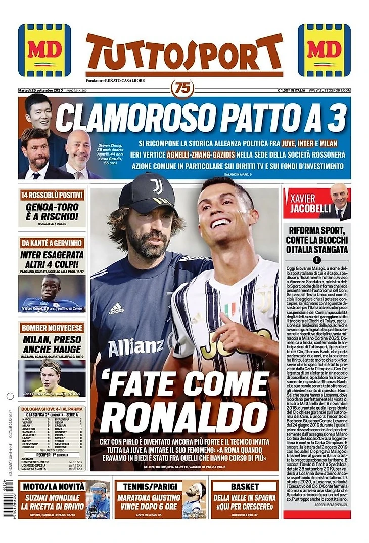 Восстанавливается исторический политический альянс между «Юве», «Интером» и «Миланом». Вчера встреча Аньелли-Чжэн-Газидис в офисе красно-черного клуба. Совместные действия по тв-правам и инвестиционным фондам.