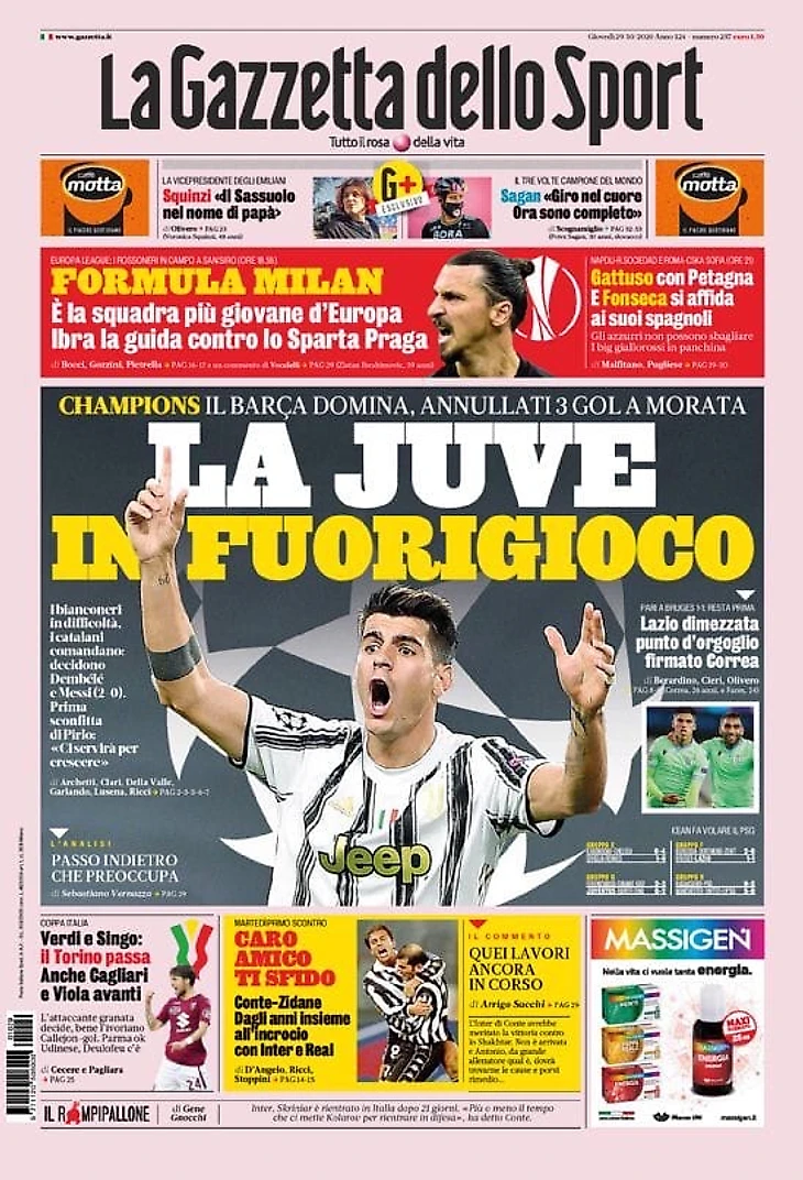 Поражение «Юве» от «Барсы» с тремя отменёнными голам Мораты, ничья «Лацио» с «Брюгге» и сегодняшние матчи «Милана», «Наполи» и «Ромы» в Лиге Европы – в утреннем обзоре заголовков итальянских спортивных изданий в блоге «В гостях у Кальчо».