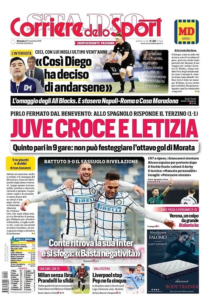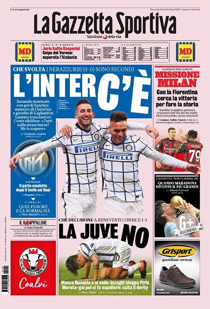 Ничья «Ювентуса» с «Беневенто» без Роналду, победа «Интера» над «Сассуоло», поражение «Аталанты» от «Вероны», а также сегодняшние матчи «Милан»-«Фиорентина» и «Наполи»-«Рома» – в утреннем обзоре заголовков итальянских спортивных изданий в блоге «В гостях у Кальчо».