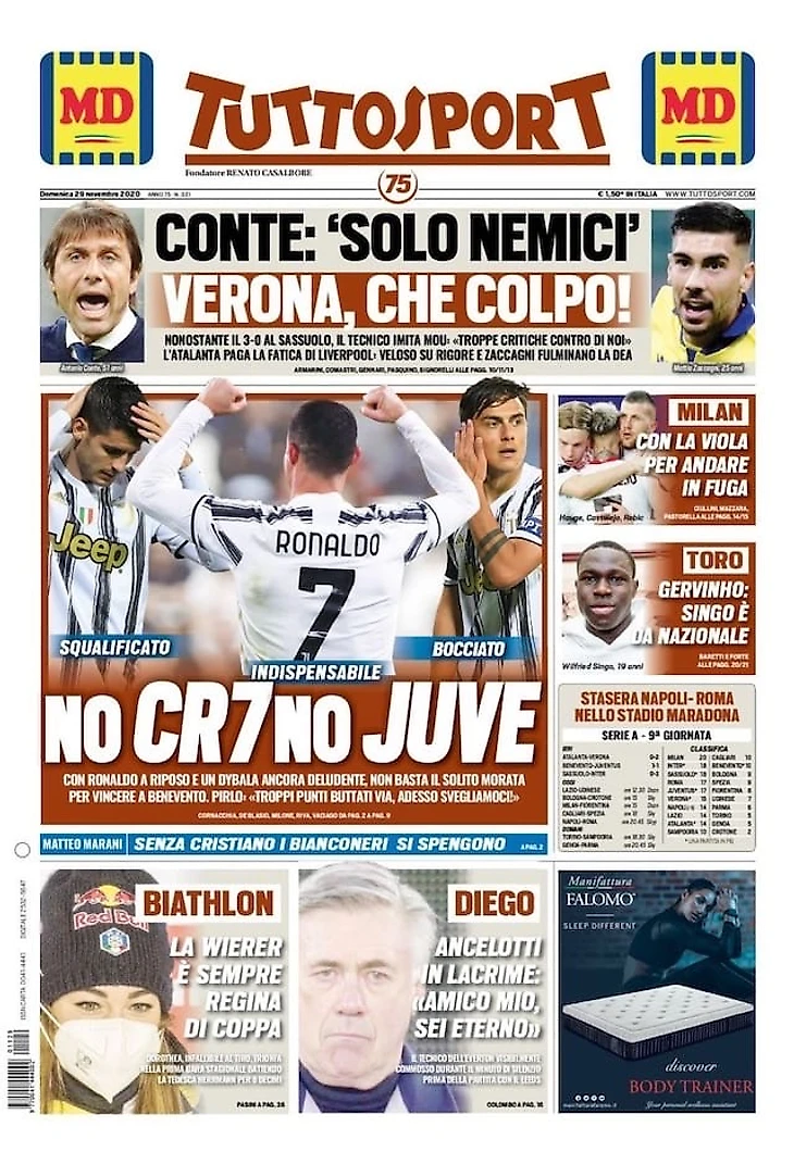 Нет CR7 – нет «Юве». Заголовки Gazzetta, TuttoSport и Corriere за 29 ноября