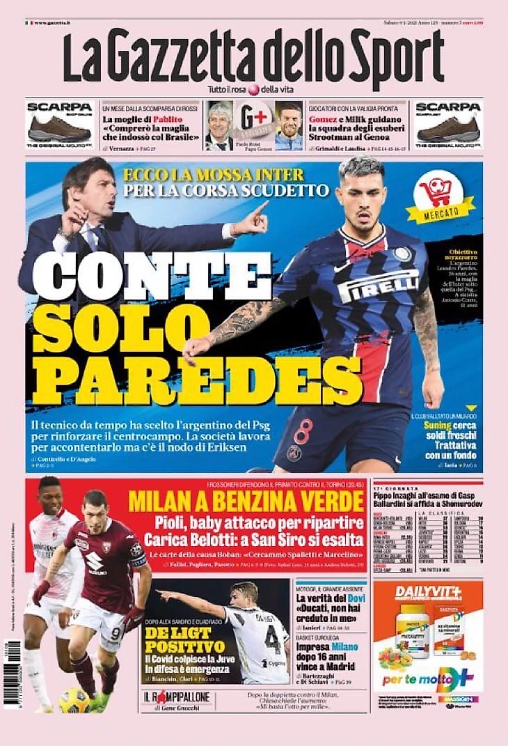 Выбор Конте в пользу Паредеса, конфликт «Интера» с агентом Эриксена, очередной случай Ковида в «Юве», а также матчи «Милан»-«Торино» и «Беневенто»-«Аталанта» – в утреннем обзоре заголовков итальянских спортивных изданий в блоге «В гостях у Кальчо».