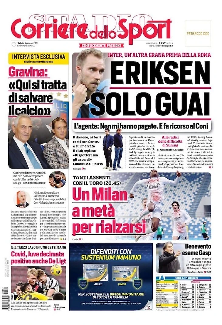 Конте, только Паредес. Заголовки Gazzetta, TuttoSport и Corriere за 9 января