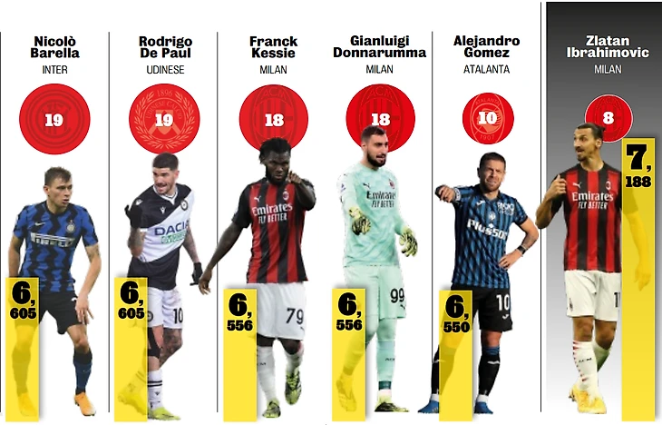 Стоит также отметить, что всего 2 игрока в сезоне ни разу не получали оценку за матч ниже 6.0 – это миланисты Симон Кьер и Джанлуиджи Доннарумма. Ещё один игрок «Милана» – Давиде Калабрия показал самый большой рост оценки по сравнению с прошлым сезоном – +0,755 балла (с 5.587 до 6,342). А вот Пауло Дибала, ставший в прошлом сезоне лучшим с 6.806, напротив, пока показывает самый большой спад – более чем на целый балл (-1,106, до 5.70). Калабрия также попал в число игроков, которые получали оценку ниже 6.0 всего 1 раз из 19. Помимо него в список вошли Аудеро, Барелла, Краньо и Де Пауль.