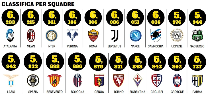 Среди команд самый высокий средний балл также у «Аталанты» – 6.283. Следом идут два претендента на Скудетто – «Милан» с 6.215 и «Интер» с 6.141. На 4 месте неожиданно (неожиданно ли?) расположилась очень крепкая «Верона» Юрича с 6.106. «Ювентус» лишь 6 с оценкой 6.086. Шестёрка худших команд весьма предсказуема: на 15 месте «Дженоа» с 5.876 (провальный старт, но подтянулись с приходом Баллардини), 16 – «Торино» с 5.871 (Каиро бездействует и топит клуб), 17 – «Фиорентина» с 5.848 (провальный старт с Якини, нестабильные результаты с Пранделли), 18 – «Кальяри» с 5.843 (серия поражений не прошла даром), 19 – «Кротоне» с 5.802 (просто главный аутсайдер чемпионата) и на 20 месте «Парма» (американские владельцы начали с энтузиазмом на трансферном рынке, но Ливерани в очередной раз провалился).