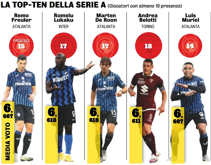 А лучшим в первой половине сезона достаточно неожиданно стал Ремо Фройлер, который за 15 матчей набрал очень хорошие 6.667. Следом за ним второе-третье места делят Ромелу Лукаку и Мартен Де Рон с 6.618. «Аталанта» вообще лидирует в этом рейтинге с 4 игроками (Фройлер, де Рон, Муриэль и Гомес), по 2 игрока у «Милана» (Кессье и Доннарумма) и «Интера» (Лукаку и Барелла), и по 1 у «Торино» (Белотти) и «Удинезе» (Де Пауль).