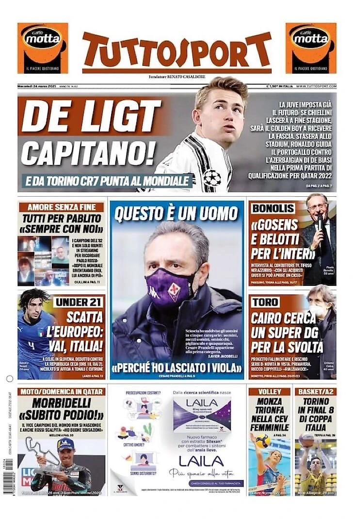 «Юве» уже закладывает будущее: если Кьеллини уйдёт в конце сезона, повязку должен будет получить Золотой мальчик. Этим вечером на «Стэдиуме» Роналду поведёт Португалию против Азербайджана Де Бьязи в первом матче квалификации в Катар-2022.