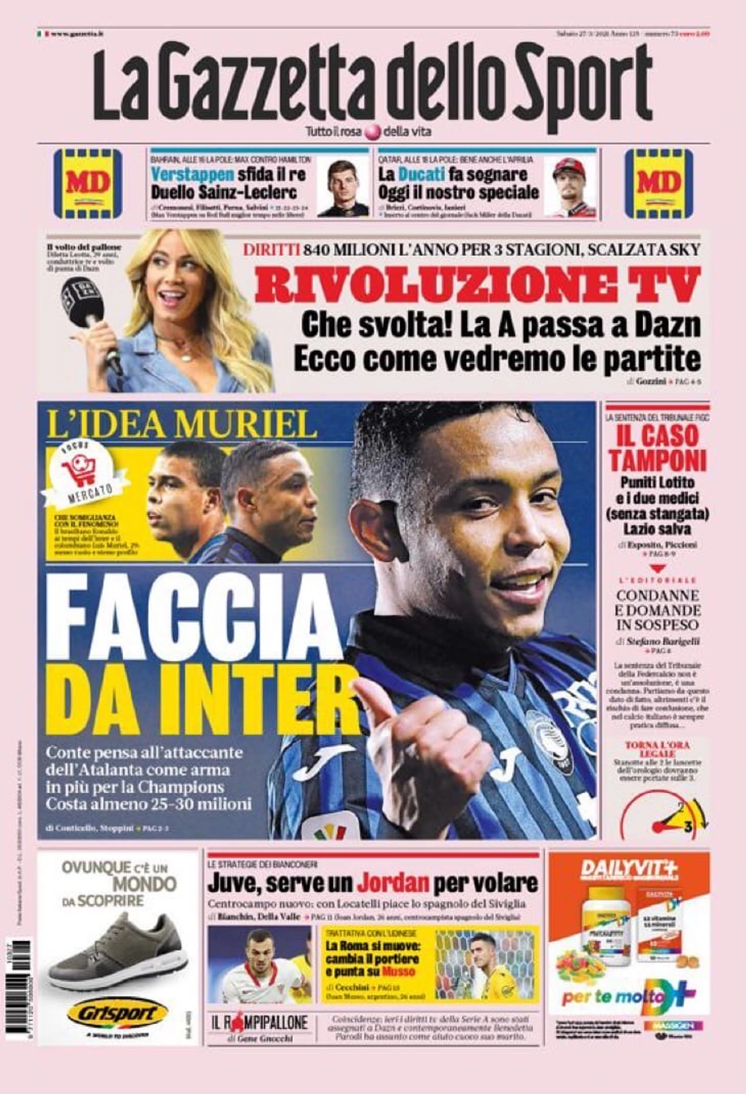 Интерес «Интера» к Муриэлю, договор Серии А на показ матчей с DAZN, возможное возвращение Дибалы к туринскому дерби, а также наказание для Лотито и врачей за «дело тестов» – в утреннем обзоре заголовков итальянских спортивных изданий в блоге «В гостях у Кальчо».