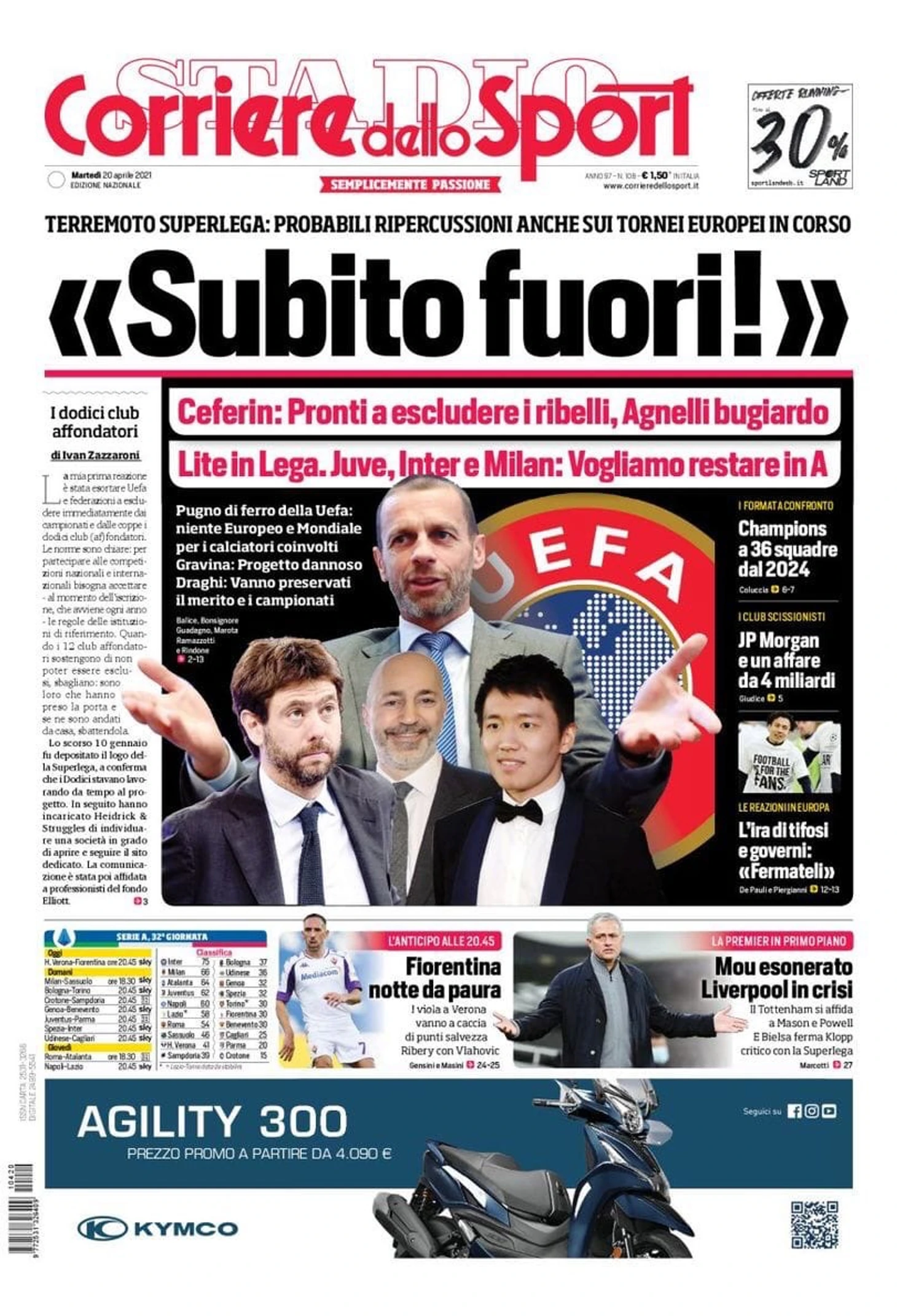 Землетрясение Суперлиги: возможные последствия также на текущие европейские турниры. Чеферин: «Готовы к исключению восставших, Аньелли – лжец». Конфликт в Лиге. «Юве», «Интер» и «Милан»: «Хотим остаться в Серии А». Железный кулак УЕФА: никакого Чемпионата Европы и Мундиаля для вовлечённых игроков. Гравина: «Вредный проект». Драги: «Заслуги и чемпионаты должны быть сохранены».