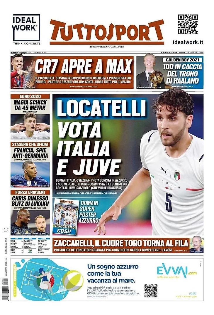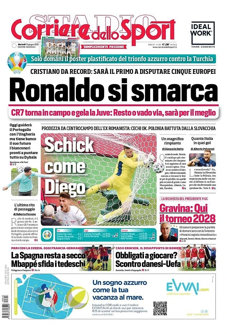 Возможный уход Роналду из «Юве», вчерашние и сегодняшние матчи Евро-2020, а также завтрашняя игра Италии со Швейцарией – в утреннем обзоре заголовков итальянских спортивных изданий в блоге «В гостях у Кальчо».